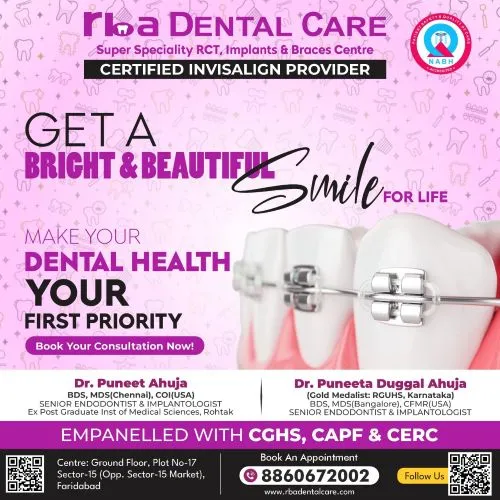 The Best Dental Clinic in Faridabad Experience exceptional dental care at RBA Dental Care, the top super-specialized center in Faridabad. Our services include microscopic, laser, and root canal treatments, along with lifetime warranty implants. With the best root canal treatment specialists, bridge crown dentists, and cosmetic dentists, we provide comprehensive oral care. Trust our top orthodontists, oral surgeons, and periodontists for the best results. Visit our modern dental center in Sector-15, Faridabad, for the best dental implants, braces, and cosmetic dentistry. Choose us for top-quality care and a lifetime commitment to your dental health.